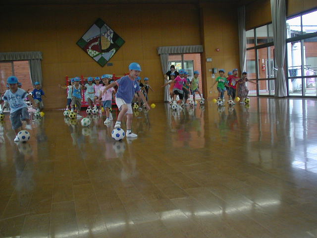 最後は前にもやった『だるまさんがころんだ』ゲームです(%笑う男%)(%笑う女%)(%音符2%)(%音符1%) ドリブルしながらコーチがだるまさんがころんだ!と言って振り向くとみんなはストップします(%笑う男%)