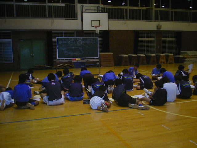 そして、みんなが書き終えてからみんなの用紙を見ているとコーチに一つの疑問が・・・。チームの全体目標が一丸となる!とあるのに一週間後の目標、明日の目標が、自分の事しか考えていないテーマばかり・・・。それが一ヶ月後に一丸というチームの為に考える事が出来るのだろうか???と疑問に思い、また主将、副主将を呼んで一緒に考えました(%ニヤ男%)(%涙%) このまま書いただけではやっぱり変わらないぞ!一丸ってどういう意味だ???と2人に質問。