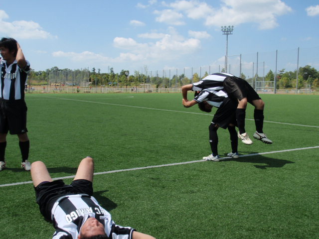 アップまでの時間、アップの段階で汗がどうしようもないぐらいに吹き出てくるし、非常に日差しも強くてまいってしまいそうでした(%痛い男%) とは言っても相手も同じ条件の中やるので、言い訳も出来ないしきちんと準備をして良い試合をしようと思っていました(%笑う男%)