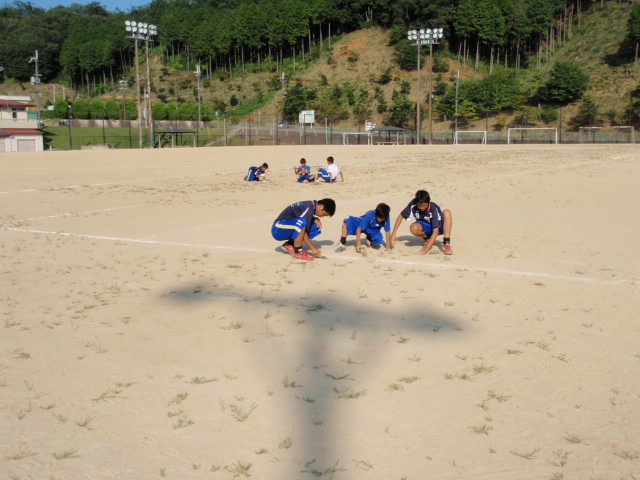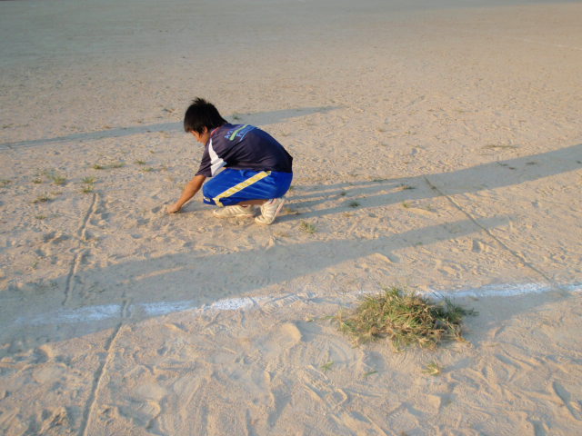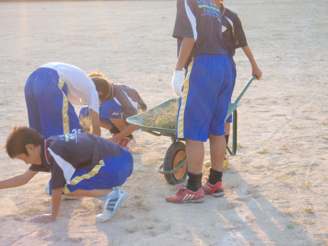 今日は防災での試合を終えて八千代に戻り、今日体育祭だった中区、加美区のメンバー以外で前々からずっと気になっていた草を引きました(%ニヤ男%) 非常にたくさん生えていて、野球とサッカーが使う間ぐらいの場所にかなりの量があり、気になっていたので今日も11名しかいないのもあり、みんなで一度しっかりと草引きをしよう!!と思ってやりました(%笑う男%) それぞれに昨日指示していた、各自の『武器』を持ってきてもらったのですが、中には何も持たずに素手で来た草引きをナメた子もいました(笑)