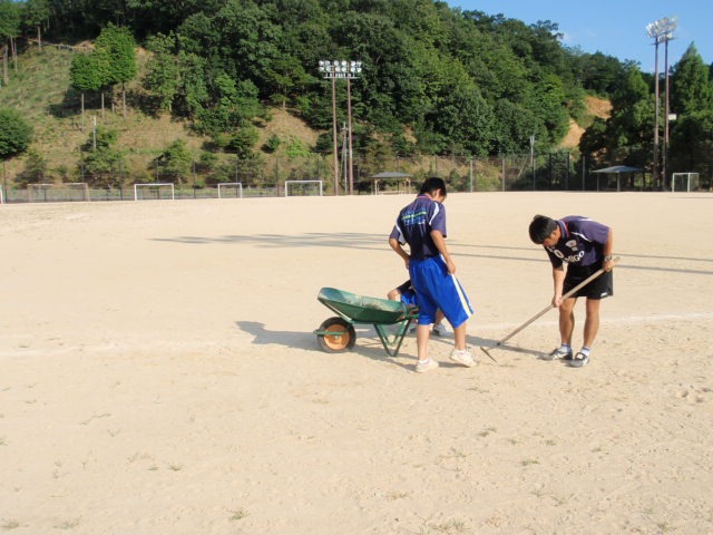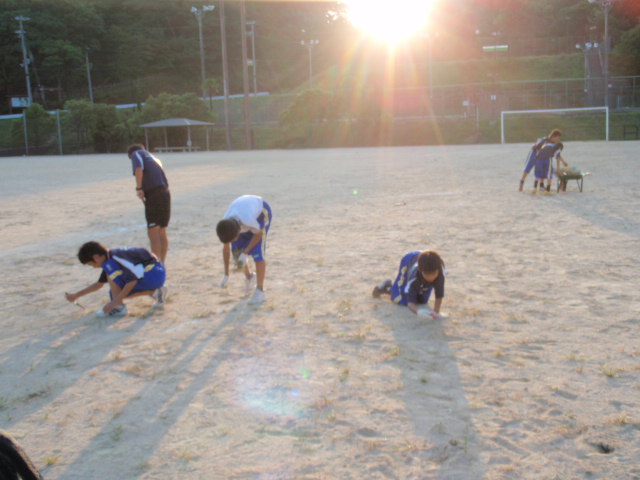 それぞれの気質というのがよく見えます(%ニヤ男%) 元気な時はがんばるけど、段々休む子や、止まっている子など、要領の良い子が出てきます(%怒る男%) これは誉められる行為ではありません(%怒る男%) ボランティアそのものは良い行為であっても、せっかくやる時間に手抜きして怒られたり、サボっても意味がないと思う(%怒る男%) 今日は一人一人をゆっくり見る時間はなく、自分も一緒になって市位監督ともやっていたのですが、たまに全員に目を配るとしょーもない事をやっている子は多くいました(%怒る男%) 最終的には全体として本当によくやったと評価をしたいのですが、やはり細かい部分で言えばもっとしっかりと本人が気付くのか?気付かせてやる仲間がいるのか?というのがいると思う。
