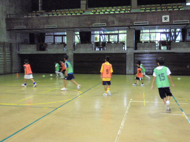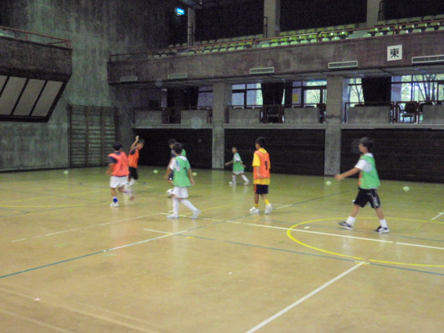 今日は急に室内練習になったのもあって人数が半分ぐらいだったそうですが、1年生〜6年生までが集まってにぎやかになってきた中で練習が開始されました(%笑う男%)(%右足%)