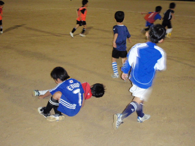 1年生はまだまだ『団子サッカー』になってしまうので、それは当然でもありますが団子になると接触も増えるし、こける子も多くなります(%痛い男%)(%ニヤ男%) 痛い経験ですが、そういう中から子供なりに考えて広く使うサッカーをするようになっていくので、今はそういう団子から逃げたりしないようにさせたいと思っています(%笑う男%)