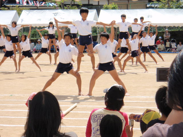 その後には全員のダンスもあったりして楽しく見させてもらいました(%笑う男%) どれもみんなが一生懸命にがんばる小学校の運動会はとても楽しいし、元気な気持ちをもらえます(%ニコ男%) そして午前の最後にはメインイベントになる組体があったので、それを見てから最後の学校に移動しようと思いました(%笑う男%)