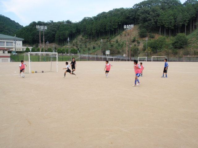 最後はゲームをしました(%笑う男%) 得点はどんな形でも良いのですが、ヘディングシュートだけはその決めた子にポイントというルールで行ないました(%ニコ男%) ゼッケンなしチームは攻撃にすごいアイデアが詰まっていて、隆次くん、雄飛くん、宗希くんが中心となった攻撃は多彩でした(%笑う男%)(%音符2%) 一方、ゼッケンチームは一人一人がしつこく、そしてパワフルながんばりを見せて対抗し、試合自体はゼッケンチームが6−5で勝利をしたのですが、ゼッケンなしは簡単にシュートをしないでヘディングに持っていく工夫を常にしていたのは見事だったし、実際に2点ヘディングを決めた事はさすがでした(%笑う男%)(%王冠%) その攻撃を引き出していたのは隆次くんで、さすが多可でも屈指の司令塔ですね(%ニヤ男%)(%星%) サッカーの醍醐味とも言える楽しみ方をよく知っている選手だし、これからもそうやって楽しむ事を忘れずに自分を磨いてほしいと思います(%ニコ男%)