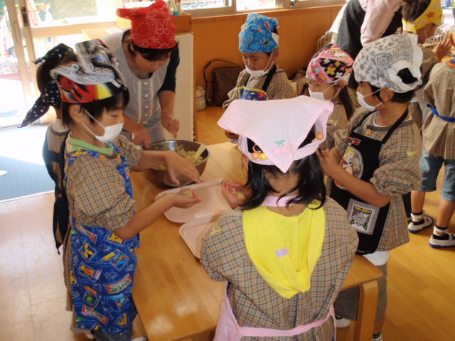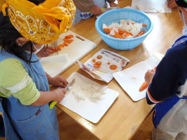 こちらはお汁作りの組で、こちらは包丁を使うので非常に危険も伴う中ではあったのですが、先生方や保護者の方々の気配りもあって各自上手に使っていたと思うし、こういうのをきっかけに料理が楽しくなる子もいると思う(%笑う男%) 家でもどんどん手伝いとすると思うし、そういういろんな事が出来て、いろんな事がやってみたい年頃なので料理の時間はきっとみんなのお手伝いが増えると思います(%ニヤ男%)(%ニヤ女%)