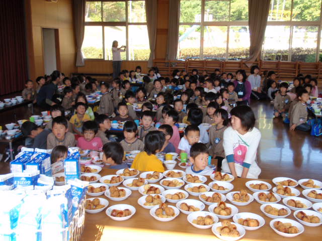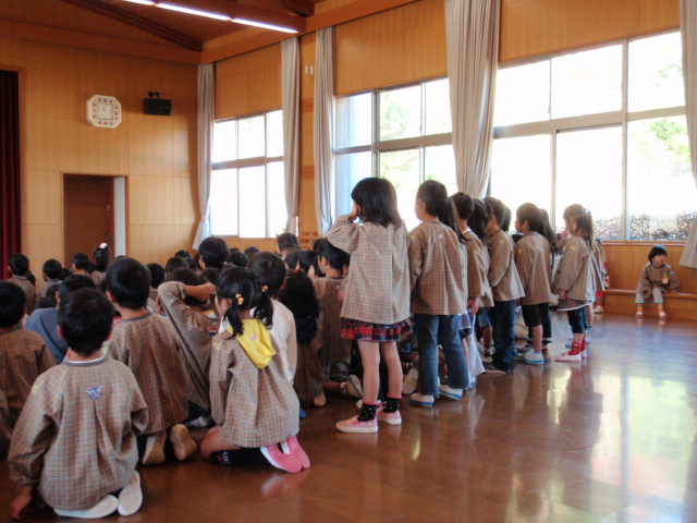 『おいもを使った物語』がありました(%笑う男%) 今日の話は、『魔法使いのゴーとさつまいも』というお話でした(%ニコ男%) ここですばらしいと感じたのは子供にも分かりやすい話の内容と、セリフの感情の込め方、話のリズムがとても子供を引き付けるから最初は適当に聞いていた子も、最後のほうにはこうして後ろのほうの子は立って聞き入るほどの興味の入り方でした(%笑う男%)(%星%) こういう子供を引き付ける事が出来る先生方の力ってすごいなぁ〜と思いながら感心して見させてもらいました(%笑う男%)(%音符1%)