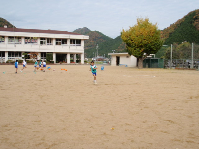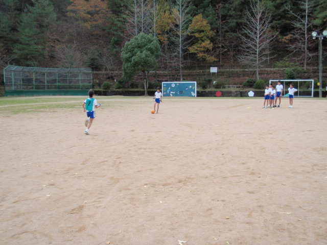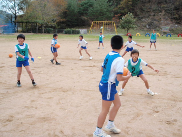 その次は3色のまま、一つの色がボールを持って走り、残りの2チーム(8人)が2人ずつラインの上に立って突破を防ぐ役目をしました(%ニヤ男%) 守る側はラインの上しか動けないのですが、2人で協力したり、前後で協力するなど工夫があったし、突破するほうも、うまく体を使ってフェイントしたり、味方の協力を待ったり、おとりに使うなど、予想以上に上手にみんながゲームをやっていたので見ていても面白かったですね(%笑う男%)(%音符2%) みんな、お互いに駆け引きをしながらだったので表情も良かったし、ズルをしたりするような子が一人もいなかった。。。。