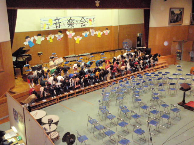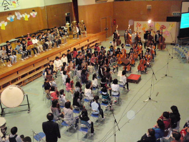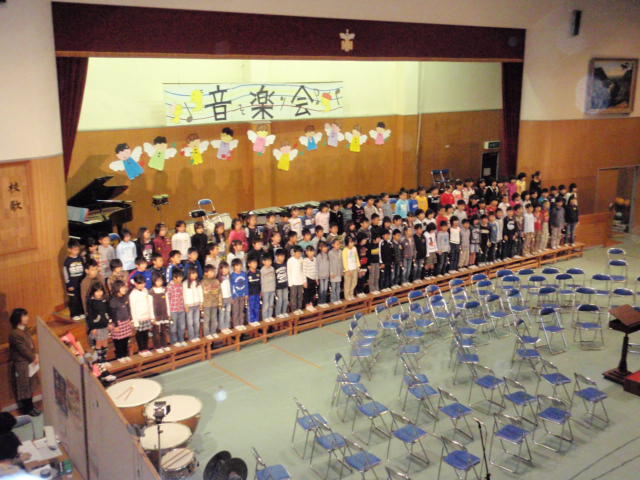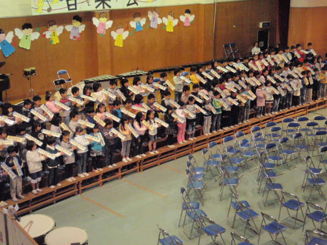 中学校で言う文化祭の合唱コンクールと同じような感じで、学年、クラスごとに歌を歌ったり楽器を演奏したりというものでした(%笑う男%)(%音符2%) 上の学年になる程、楽器も豪華で5年生以上になるとドラムも入ったりとかなり曲としても本格的でした(%ショック男%) 1,2年生はピアニカ演奏、3,4年生はリコーダー演奏を綺麗にみんなで奏でていました(%笑う男%)(%星%)