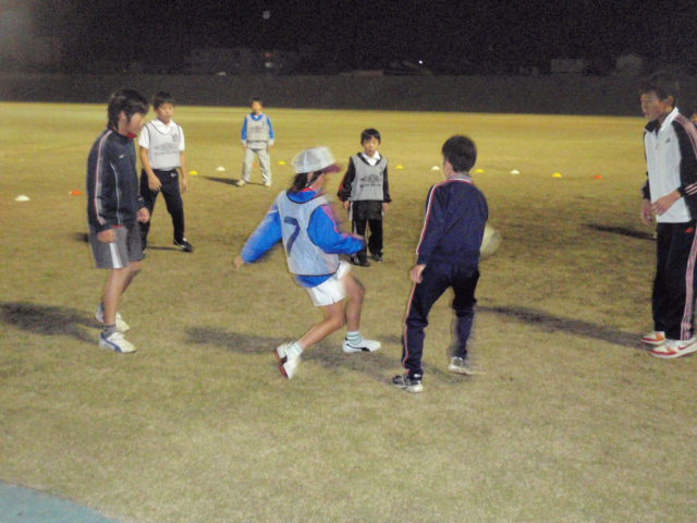 『周りを感じよう!』という事でした。今日は途中に『間接視野』という事を話しました(%笑う男%) これは直接見るのではなく、前を見ていながらもいろんな方向のものが見えるという視野の事で、それを使ってドリブルをしよう!と言いました。直接見てしまうとどうしてもボールを見失ったり相手を見えていなかったりするので、間接視野で相手を感じる事を徹底的に意識してもらいました(%笑う男%)