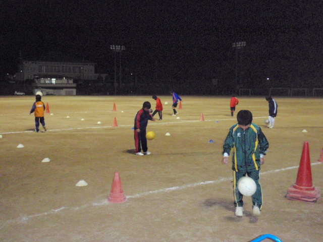 今日も最初からリフティングと言っても体が動かないのは分かっていたので、最初にコーンをいろいろと並べたドリブルサーキットをやりました(%ニヤ男%) これはきちんと局面の意図があって、きちんとタッチしていけばドリブルをする上でも身になるものだったので個人のペースでありながらもきちんと取り組んでもらいました(%笑う男%) 何も指示をしない時の『自由』な時間こそ、個人の発想力が一番発揮されるのですが、黙ってみているとやはりうまい子はいて、ボールを浮かすとか、運ぶ事に関してきちんと狙いを持てている子がいました(%笑う男%)(%星%)