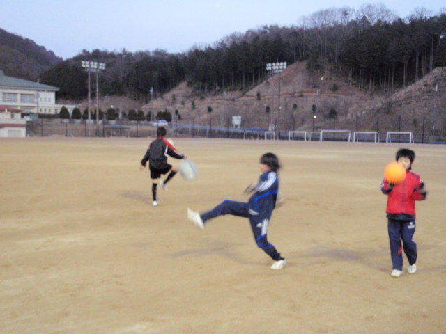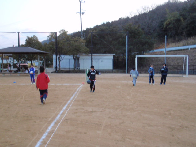 その後は、ちょっとキックの種類、精度、狙いという事をテーマにサッカードッジをやってもらいました(%ニヤ男%) その名の通り、サッカーとドッジボールを一緒にしたような遊びで、インサイドキックのみで中にいる子を当てるというゲームです(%笑う男%) 中にいる子はキャッチすればセーフで、当てられたら外と交代するようにしたのですが、思った以上に外からのキックはよく当たっていたし、次々と入れ替わるのを見ると、狙った場所にしっかりと蹴るというのは出来ているような感じがしました(%笑う男%)