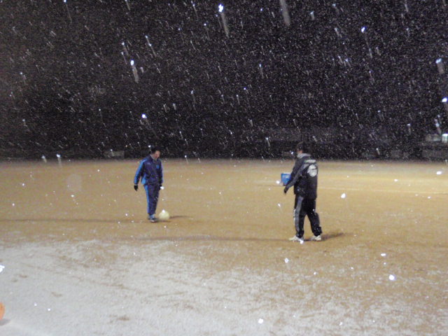 何をしても雪が画像に入ってしまうぐらい切れ間なく降ってくる状態だったので、この時はグランドがまだ土の場所が多いのですが、終わる頃には見事に練習した場所以外は真っ白になっていました(%ニヤ男%)