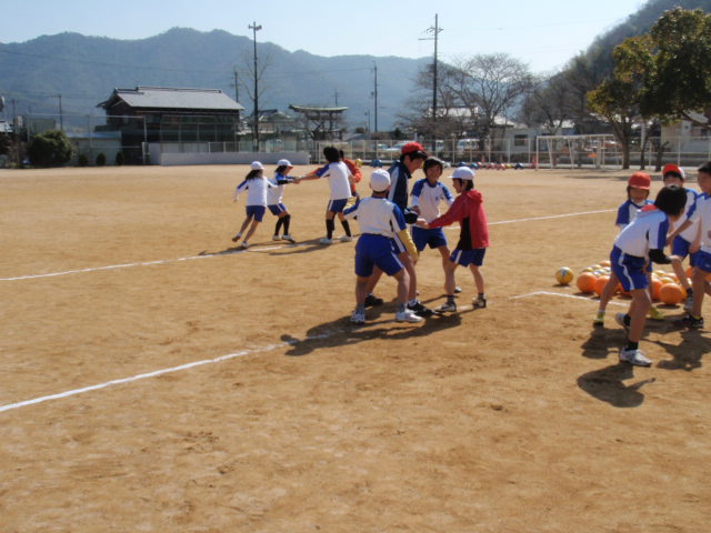 昨日出会っているので細かい自己紹介もいらなかったし、早速メニューをスタートさせました(%笑う男%)(%音符2%) まずは4人組での一人が鬼になって追いかける鬼ごっこをしました(%ニコ男%) これは高学年になってくると楽しさが理解出来るゲームだと分かってきたので使うようにしているのですが、鬼は横から回ってターゲットの一人をタッチするのですが、3人でうまく回りながら逃げるこのゲーム。理解も簡単で、しっかりと動いてくれました(%笑う男%)(%音符2%) つかみの雰囲気がうまくいったので今日はとてもやりやすかったです(%ニヤ男%)(%星%)