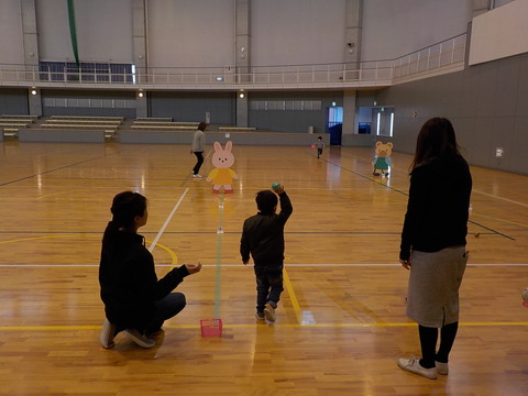 道具も手作りで、温かみがあるものばかりだったので子供達もとても楽しそうでした!アリーナを5周走るマラソン、30m走、立ち幅跳び、バランス、ボール投げがありました♪何をやろうとしているのか?もよく理解していないような感じではありましたが(笑)、とにかく一緒にいるお母さん方が喜んでくれているから・・・みたいな感じで言われるがままにやっていましたね!言葉が通じないこの年代だけれど、親の温かみというものは確実に伝わっています。安心出来る場所、言葉、表情、空気、そういったものを確かに感じ取っている事が分かりました。