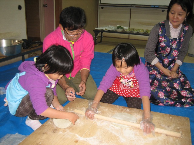 腰を入れてこねて、こねて。(%ひよこ%)みんな地元の先生に教わりながら初体験。