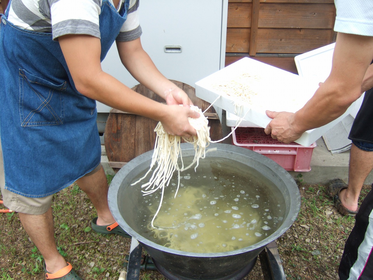 ④ 切り終わったら、大鍋で湯がいた後、氷水でキンキンに冷やします。
