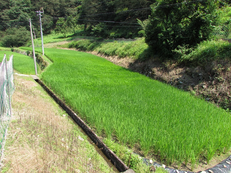 5月に田植えした餅米の稲は元気に育っていました。秋の稲刈りと餅つき。こちらも今から待ち遠しい。