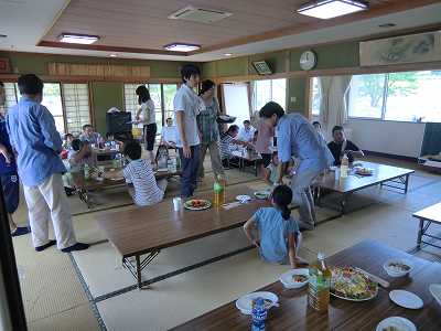地元産のお米や野菜を使ったカレー、ソーメン、漬け物などをみんなで食べました。