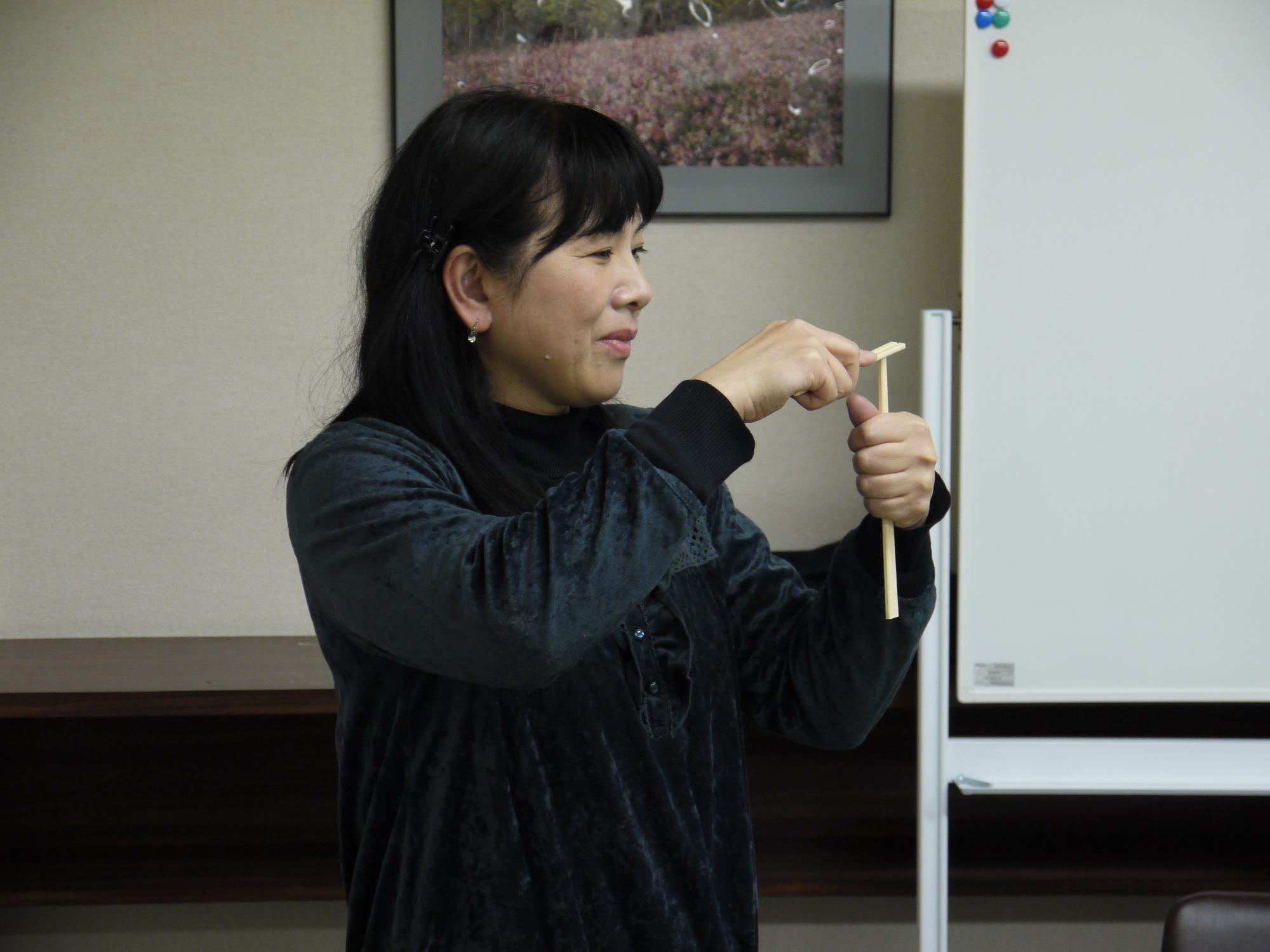 次は、Mさんが「割り箸が静電気で動き出す」に挑戦。