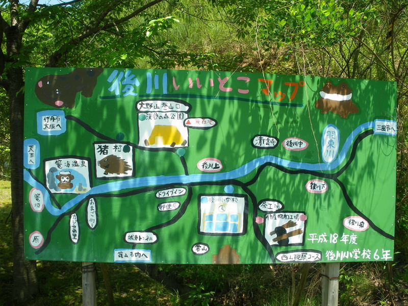写真は、別の日に丹波渓谷の森公園に訪れたときのものです。この日はいい天気でさわやかな風に乗って鳥の声がよく聞こえて・・・。とても癒される場所ですね。公園の入り口に地元小学生のつくった後川いいとこマップがありました。ほのぼのしますね。(%笑う男%)(%笑う女%)