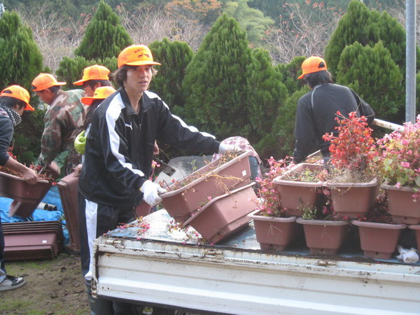 国道沿いのプランターの土を入れ替えます。枯れ枯れになって残っていた草木を手で抜いて袋に詰め込みます。で、シャベルで土をすくって車に積みます。