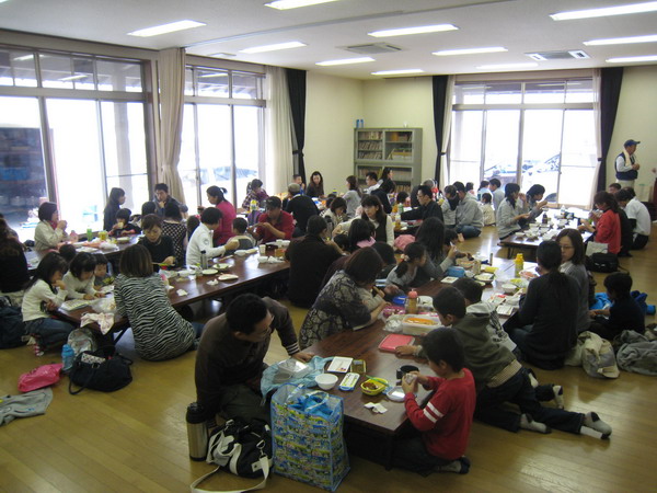 収穫の後は公民館でお昼ご飯。元気に「いただきます」を言ってから食べます。わー元気ですね。(%ニコ男%)(%ニコ女%)