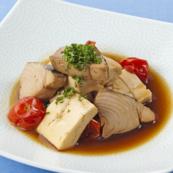 かつおはたんぱく質にビタミンB6、ビタミンB12など代謝にかかわる栄養素と、鉄分が含まれ、女性におすすめ。あえてチーズは使わず、女性ホルモンに似た働きをするイソフラボンを含む豆腐にして女子力もアップ!