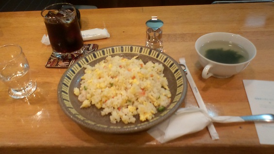 ランチとしていただいたエビピラフとアイスコーヒーが