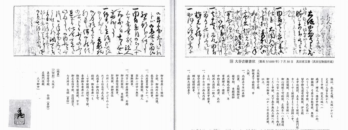 「大阪城を家康から取り戻したこと、西国諸大名が結集して秀頼を支える決意であること、真田の妻子は吉継が預かっていること、など力添えを求める内容。」(慶長5年/1600年7月30日)
