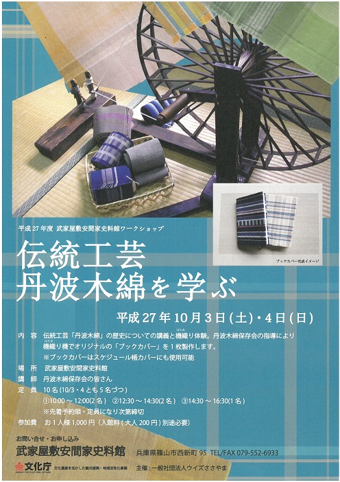 伝統工芸「丹波木綿」の歴史についての講義と機織り体験。丹波木綿保存会の指導により機織り機でオリジナルの「ブックカバー」を1枚製作します。※ブックカバーはスケジュール帳カバーにも使用可能。