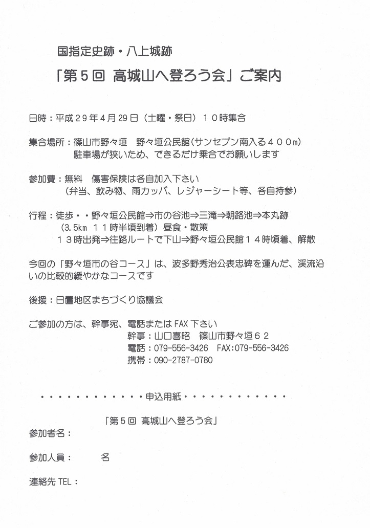 【主催・連絡先】高城山へ登ろう会 山口喜昭【篠山市野々垣62)