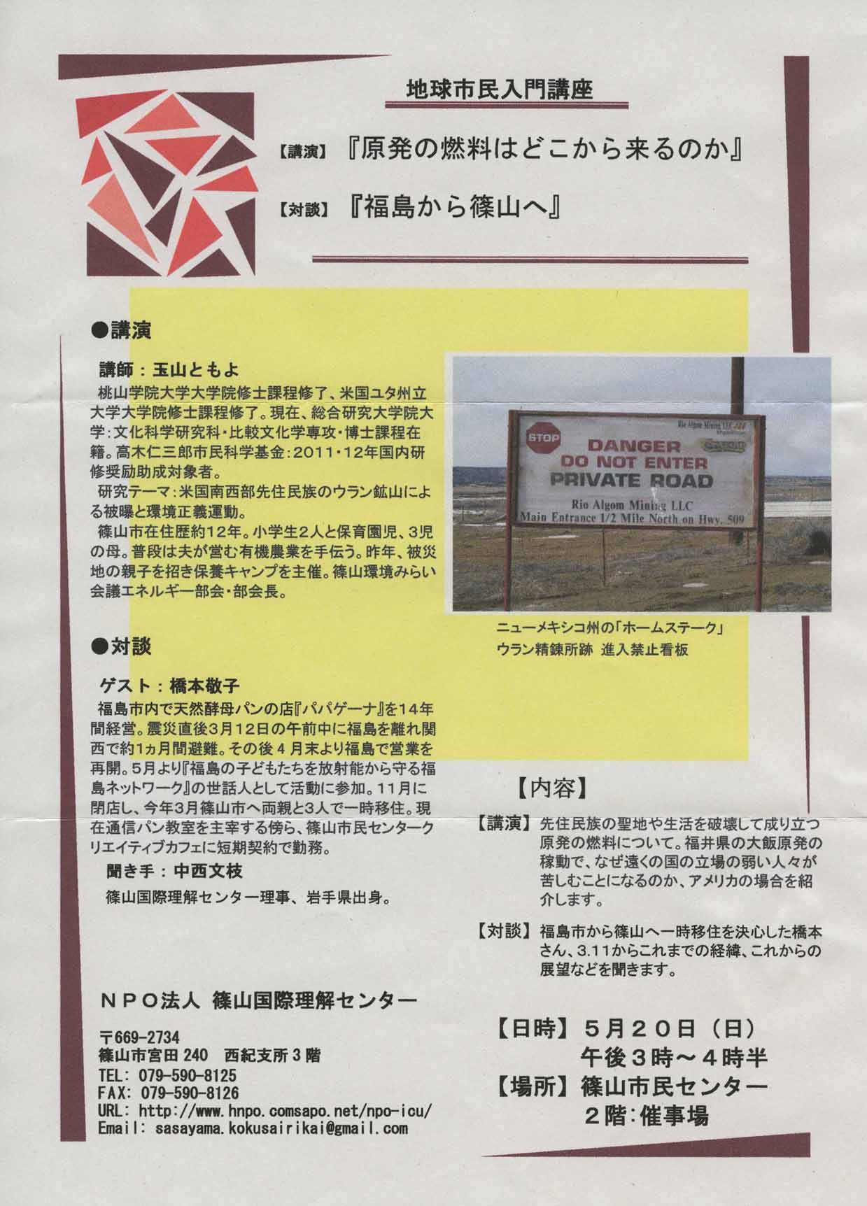 当プラザの登録団体であるNPO法人 篠山国際理解センター(こちら)が開催する今回の地球市民入門講座は、【講演】『原発の燃料はどこから来るのか』と【対談】『福島から篠山へ』への2本立てです。