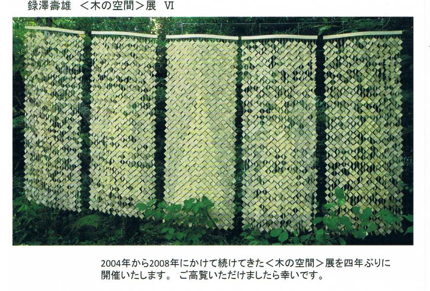 「 2004年から2008年にかけて続けてきた<木の空間>展を四年ぶりに開催いたします。ご高覧いただけましたら幸いです。」と作家の緑澤壽雄氏。http://www.geocities.jp/utagakisannroku (こちら