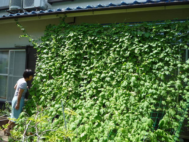 5月に種まきをし、苗の配布イベントなどで沢山の「育て隊」仲間を作りだしている我が「みどりのカーテン広げ隊」ですが、モデル宅として率先垂範で実施していただいているお家の観察会を実施しました。