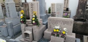 このお寺には、私が大好きな司馬遼太郎先生の小説『菜の花の沖』の主人公・高田屋嘉兵衛と妻おふさの墓と、同じく大好きな『大地の子』などで有名な小説家・山崎豊子さんのお墓があります。